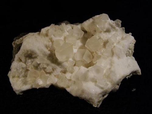 Calcite on basalt. Simple rhombs of transparent calcite to 11mm on edge rest on a bed of ’sugary’ looking calcite, which has a smooth surface. Specimen is 10cm x 8cm. Self-collected 1995 from Loch Bharcasaig, Duirinish, Isle of Skye. (Author: Mike Wood)