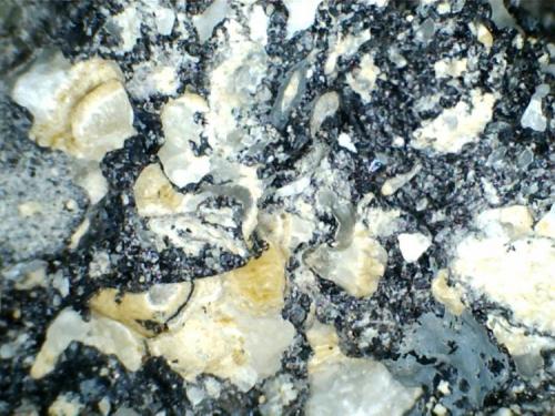 Se aprecia la trituración de los granos de arena (amarillos, con estructuras concéntricas) y la disposición algo fluida en la matriz de vidrio negro. (Autor: prcantos)