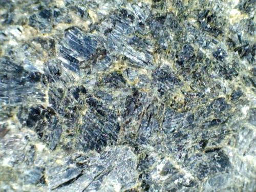Detalle de los cristales tabulares de hornblenda que forman la matriz de la roca. En algĂșn caso se aprecia lo que parece el sistema tĂpico de exfoliaciĂłn del anfĂbol (centro izquierda de la foto). (Autor: prcantos)